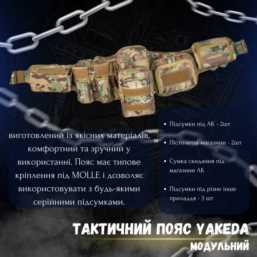 Модульний тактичний пояс yakeda виготовлений із якісних матеріалів, комфортний та зручний у використанні. пояс має типове кріплення під molle і дозволяє використовувати з будь-якими серійними підсумками.